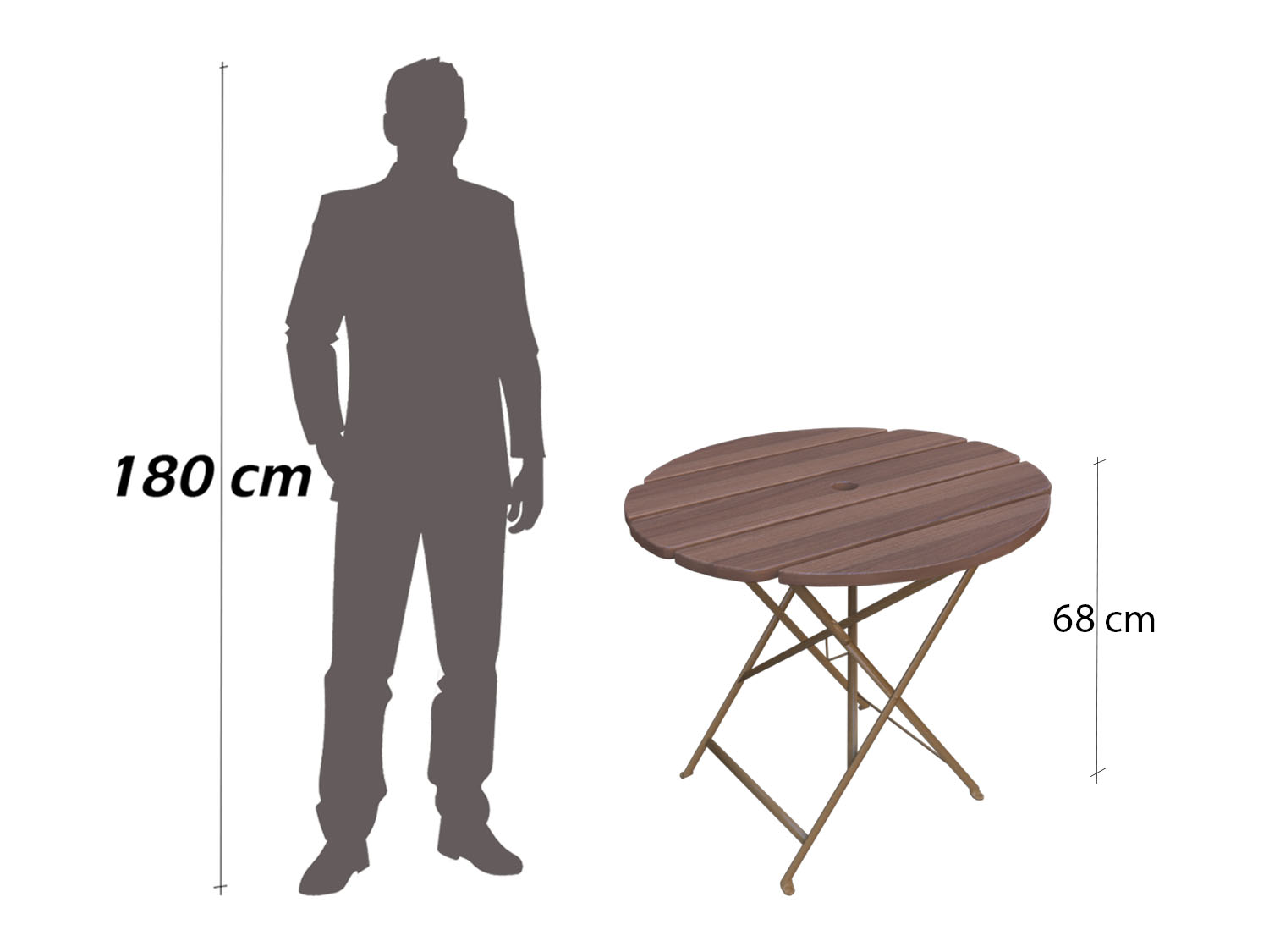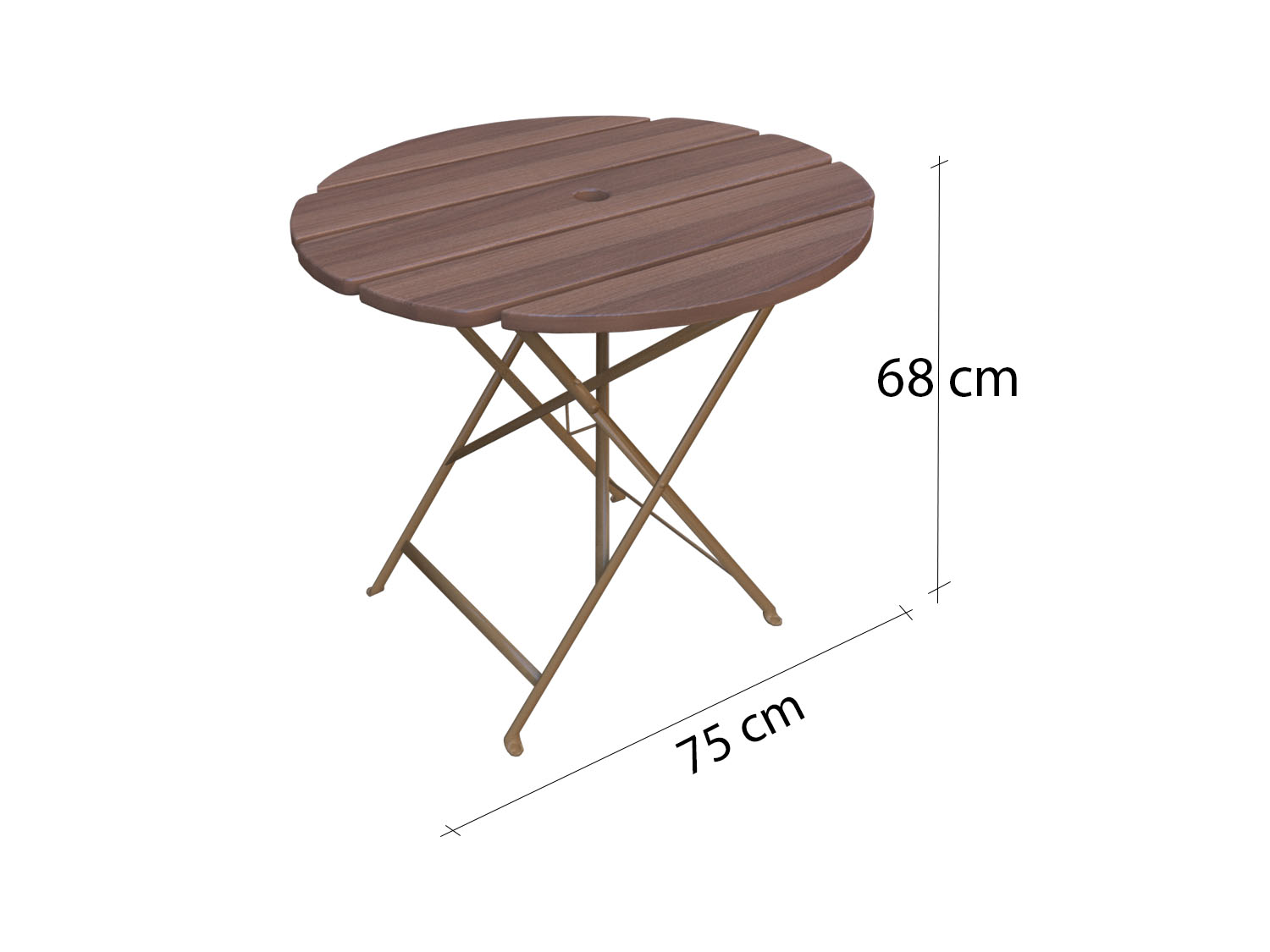 طاولة حديقة خارجية خشبية دائرية وقابلة للطي، مصممة بتصميم البيسترو الكلاسيكي. سطح الطاولة مصنوع من شرائح خشب الموسكي المتين باللون البني الدافئ، بينما الإطار والأرجل مصنوعة من الحديد المطلي بمسحوق حراري لضمان مقاومة العوامل الجوية المختلفة مثل الصدأ والشمس.